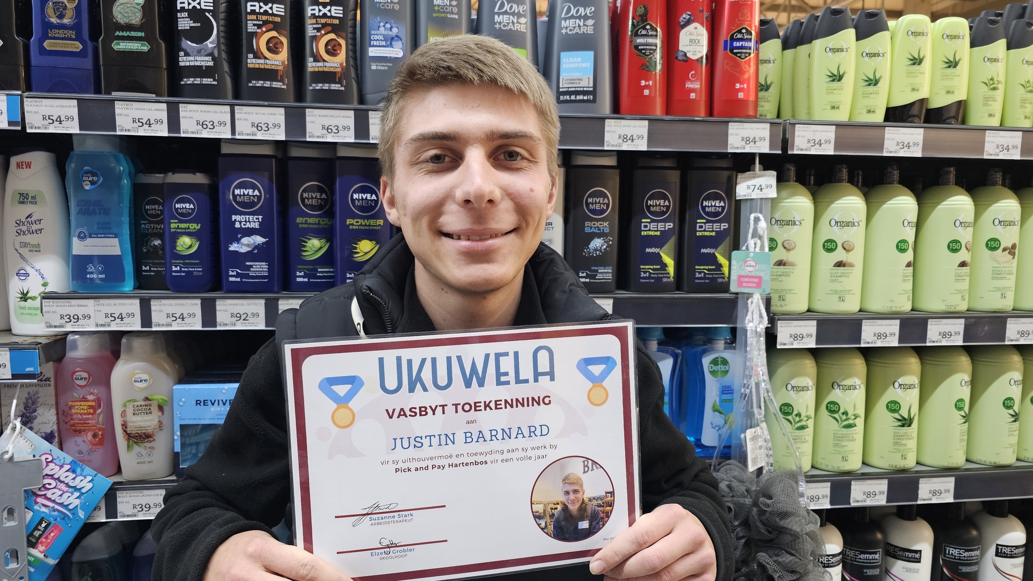 Best day ever! Justin, today we are celebrating your one-year work anniversary at Pick n Pay Hartenbos with you! You are so committed, kind and helpful and make the world a better place! Thank you to mom Charlene, Mariaan, Gert and Heinrich from Pick n Pay Hartenbos and all the teachers from Carpe Diem School, George South Africa. You are our north stars!